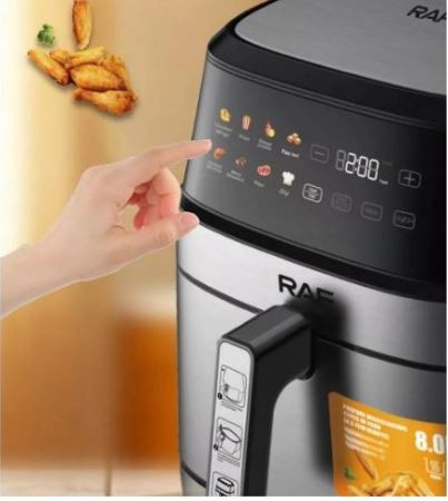سرخ کن راف آلمان مدل 5309اصلی با ظرفیت بزرگ ۸ لیتر و قدرت بالا 1700 وات : سرخ کن با ظرفیت بالا، مناسب برای انواع غذاهای لذیذ مانند: مرغ کباب، ماهی کباب، گریل، کیک، بال مرغ سوخاری، نان و کلوچه پخته شده است . سیستم گردش هوای گرم غذای آماده شده را به طور یکنواخت می پزد .دستگاه ما به راحتی تمیز می شود، می توانیم سبد بزرگ را در چند لحظه زیر آب جاری بشوییم. علاوه بر این، دستگاه ما دارای یک فیلتر به راحتی قابل جابجایی است که چربی از محصولات سرخ شده در زیر آن جریان می یابد. پس از اتمام کار کافیست آن را بیرون بکشید و همچنین زیر آب جاری بشویید.امکانات آماده سازی سریع غذا اصلی بی پایان است. فرقی نمی کند سبزیجات سرخ کنید، سیب زمینی سرخ کرده یا گوشت سرخ کنید، این دستگاه همه کاره همه چیز را به روشی سالم تر ممکن می کند .شکل کانتور سرخ کن و گردش هوای هوا باعث می شود ظروف به طور یکنواخت سرخ شوند و در نتیجه از بیرون ترد و در داخل ظریف شوند .کیفیت این سرخ کن بسیار عالی می باشد