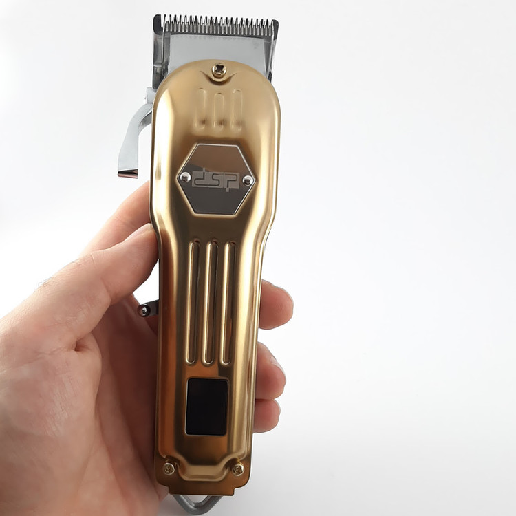 ماشینهای اصلاحی که مخصوص اصلاح موی سر ساخته میشوند، باید موتور قدرتمندی داشته باشند؛ زیرا موهای سر ضخیم بوده و نسبت به صورت و بدن تراکم بیشتری دارند. ماشین اصلاح 90394A ساخت شرکت «دی.اس.پی» با داشتن موتور لرزشی فوق العاده قوی مناسب استفاده برای اصلاح موهای ضخیم است. تیغهی ماشین اصلاح از جنس استیل پوشش داده شده با کروم است که در برابر زنگزدگی مقاوم است. به کمک این تیغه میتوان موهای سر را در اندازههای 1 تا 3.5 میلیمتر کوتاه کرد.جنس بدنه این ماشین اصلاح فلزی و در دو رنگ نقره ای و طلایی بوده که کار کردن با آن حس خوشایند کار با یک محصول با کیفیت را به شما می دهد. در کنار دستگاه، اهرم تنظیم چرخشی قرار دارد که اگر دستگاه را با دست راست بگیرد، با انگشت شست بهراحتی میتوان آن را در جای مناسب تنظیم کرد. به کمک این اهرم میتوان فاصلهی بین تیغههای بالا و پایین را تغییر داد و بدون استفاده از شانه، طول اصلاح دلخواه را تنظیم کرد. هنگامی که این اهرم به پایین فشار داده میشود، طول برش تیغهها افزایش مییابد و وقتی در بالاترین موقعیت قرار دارد، تیغهها در کمترین فاصله از هم قرار میگیرند.این محصول از باتری پر قدرت 2000 میلی آمپری بهره می برد که با 180دقیقه شارژ میتوان به مدت 200 دقیقه از آن استفاده نمود. همچنین یک صفحه LCD جهت اطلاع از میزان شارژ باقیمانده و زمان لزوم روغن کاری تیغه ، بر روی بدنه دستگاه تعبیه شده است. برای اصلاح مو در اندازههای مختلف 8 عدد شانهی اصلاح با طول برش 1.5 تا 19 میلیمتر ارائه شده که روی تیغه قفل میشوند. داخل جعبه علاوه بر شانه، برس تمیزکننده، روغن و سیم شارژ نیز قرار داده شده است.تیغههای ماشین اصلاح پس از هر بار استفاده باید روغنکاری شوند. برای این کار باید از روغن شرکت دی اس پی که داخل جعبه قرار دارد استفاده شود. توجه داشته باشید که برای روغنکاری تیغهها از گریس، روغن مو و هر روغنی که حاوی مواد نفتی یا حلال باشد استفاده نکنید؛ زیرا با تبخیر حلال آنها لایهی ضخیمی از روغن بین تیغهها باقی میماند که حرکت تیغهها را کند میکند. سیم شارژر این محصول به صورت USB ارائه شده که قابلت شارژ به وسیله آداپتور موبایل و پاوربانک را مهیا می سازد.
