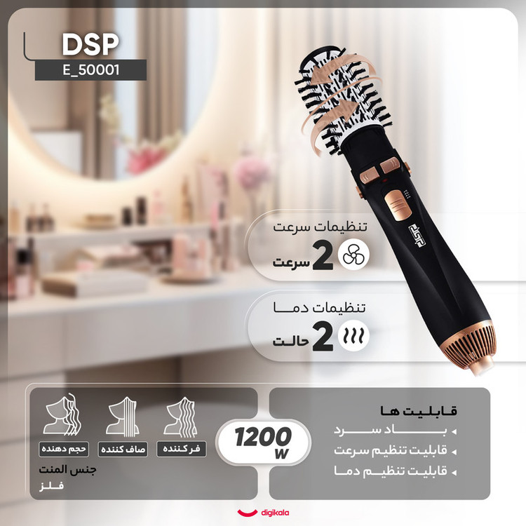 مشکل بسیاری از خانم ها در حین سشوار کشیدن موهای خود ، نگه داشتن همزمان برس و سشوار در دست است که معمولا برای این کار نیازمند کمک می باشند ، به همین خاطر این محصول از کمپانی خوش نام dsp می تواند این مشکل را حل نماید. سشوار چرخشی dsp مدل E_50001 با دارا بودن چهار سری مختلف قابل تعویض کمک می کند تا موهای شما صاف و یا حالت دار گردند. امتیاز بعدی داشتن سری چرخشی در 2 سایز مختلف می باشد که با توجه به حجم مو ، می توان سایز مورد نظرتون را انتخاب کرده و به راحتی و حتی با یک دست موهای خود را حالت دار و یا صاف کنید و در میهمانی بدرخشید.از ویژگی های دیگر این محصول هم می توان به سیم چرخشی 360 درجه ، امکان چرخش برس در 2 جهت مختلف ، طراحی ارگونومیک و تنظیم دما اشاره کرد.ویژگی بعدی، پکیجینگ کادویی این محصول می باشد که علاوه بر استفاده شخصی ، می تواند انتخابی مناسب برای هدیه به عزیزانتون هم باشد.سشوار های چرخشی نسل جدید از سشوارها هستند ، که علاوه بر قابلیت تولید باد گرم میتوانند با استفاده از برس های که قابلیت تعویض و چرخش دارند و در یک جهت به دلخواه کاربر حرکت میکنند ، علاوه بر خشک نمودن مو به آن حالت دهند . در صورتیکه بتوانید قابلیت های این دستگاه را بشناسید میتوانند مانند یک آرایشگر حرفه ای در مدت بسیار کوتاهی موهای خود را حجم دهی ، خوش حالت ، فر یا صاف نمایید.سشوار چرخشی دی اس پی با طراحی و ترکیب رنگ بی نظیری که دارد یک محصول فوق العاده زیبا و خوش دست است و میتوانید بهترین و خوش سلیقه ترین سشوار برای هر خانه وسالن باشد.