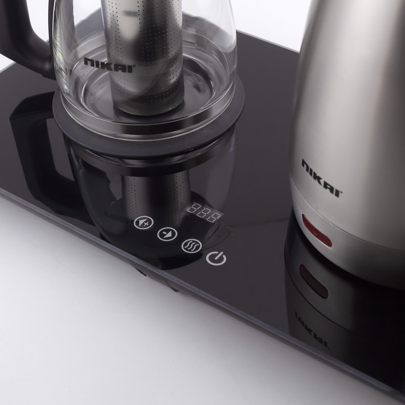 چای ساز نیکای مدل NTM-3939-SS یکی از دستگاههای چای ساز شرکت نیکای میباشد. این شرکت تولیدکنندهی محصولات لوازم خانگی میباشد. این دستگاه با ترکیب رنگ استیل و مشکی تولید و عرضه شده است. جنس کتری از استیل ضد زنگ و قوری از جنس شیشه میباشد. این چای ساز از نوع کنارهمی میباشد. بر روی کفی این چایساز کنترل پنل دیجیتال و لمسی قرار دارد. این دستگاه قابلیت تنظیم دمای گرم نگهدارنده و روشن و خاموش کردن دستگاه با این کنترل پنل را دارد. قابلیت کنترل دمای قوری، برای تهیه قهوه فرانسه و انواع دمنوش بسیار کارآمد است. این قوری همچنین دارای تفاله گیر استیل ضد زنگ است. این تفاله گیر در وسط قوری قرار میگیرد و می توان پس از دم کشیدن چای آن را از قوری جدا کرد. در زیر قوری وارمر قرار دارد. پس از اینکه قوری بر روی قسمت مخصوص قرار گرفت، قوری را گرم نگه میدارد. در قسمت خروجی کتری نیز جهت جدا سازی رسوب داخل آب یک عدد فیلتر قرار دارد. در مجموع باید گفت این دستگاه به دلیل داشتن گنجایش 1.7 لیتری کتری و 1 لیتری قوری میتواند برای پذیرایی از میهمانان با تعداد زیاد، چای و نوشیدنی گرم آماده کند. سرعت آماده سازی آب جوش در مواقعی که صبح زود قبل از رفتن به بیرون باید صبحانه را آماده کنید و وقت ندارید و یا تعداد میهمانان زیاد است، بسیار کمک کننده خواهد بود. مقایسهی زمان 3 دقیقه ای (حداقل آب داخل کتری) جوش آوردن آب تا 20 الی 30 دقیقه با کتری گازی، خود گویای صرفه جویی بسیار زیاد این دستگاه در زمان است.